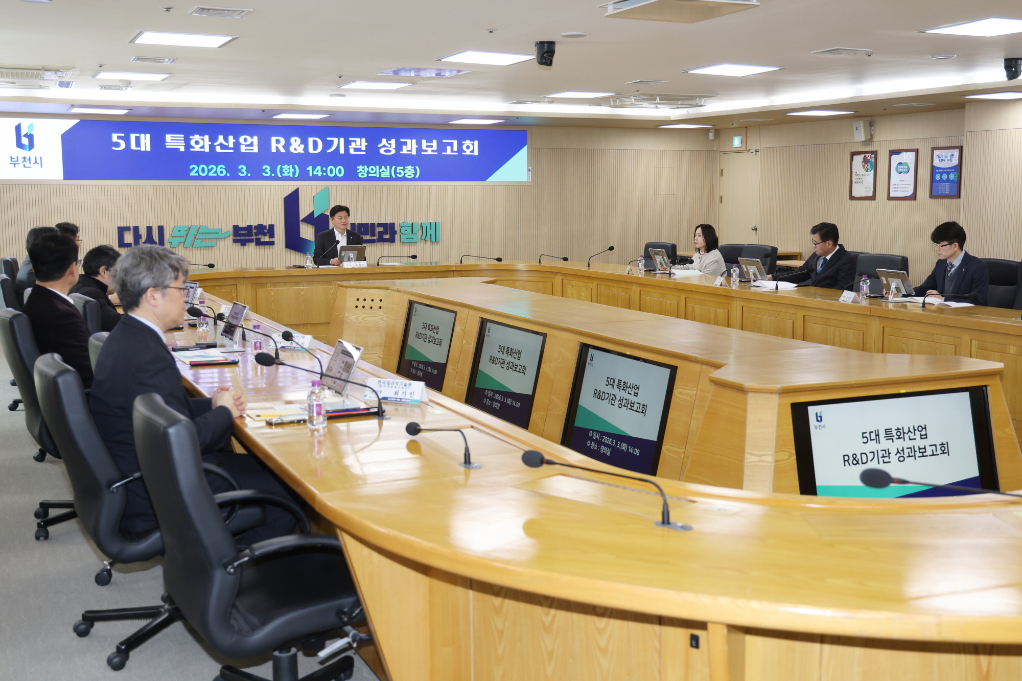 부천시는 지난 3일 시청 창의실에서 금형·조명·로봇·패키징·세라믹 등 5대 특화산업 분야 연구개발(R&D) 기관 대표들과 함께 ‘2026년 5대 특화산업 R&D기관 성과보고회’를 열었다.