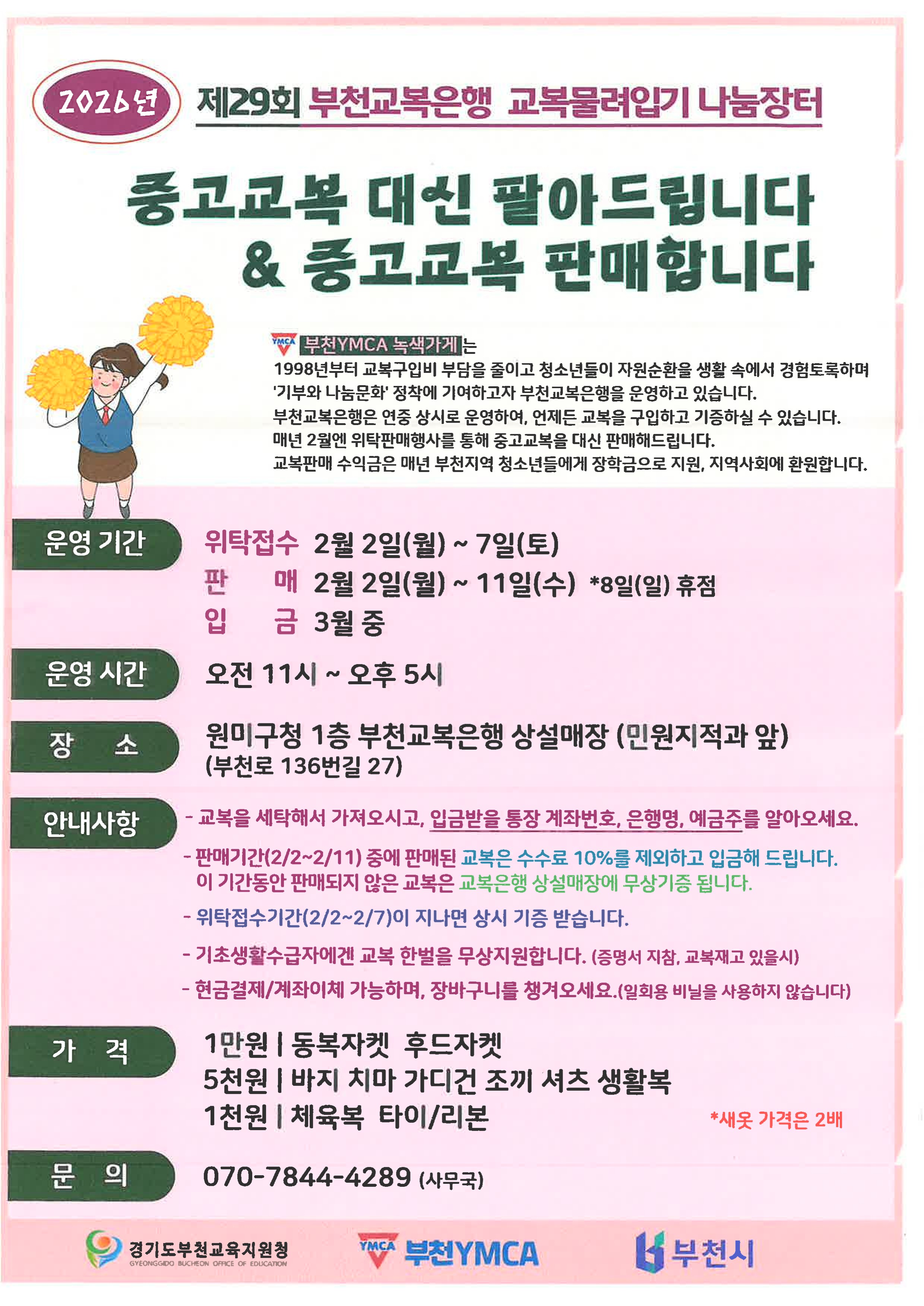 ºÎõ±³º¹ÀºÇàÀº ÇкθðÀÇ ±³º¹ ±¸ÀÔºñ ºÎ´ãÀ» ÁÙÀ̰í, Çлýµé¿¡°Ô ¹°ÀÚ Àý¾à ¹× ÀçȰ¿ëÀ» ÅëÇØ ȯ°æº¸Àü ÀǽÄÀ» ³ôÀ̱â À§ÇÑ ±³º¹ ¹°·ÁÁÖ±â»ç¾÷ÀÇ ÀÏȯÀ¸·Î ºÎõYMCA¿¡¼­ ¿î¿µÇϰí ÀÖ´Ù.